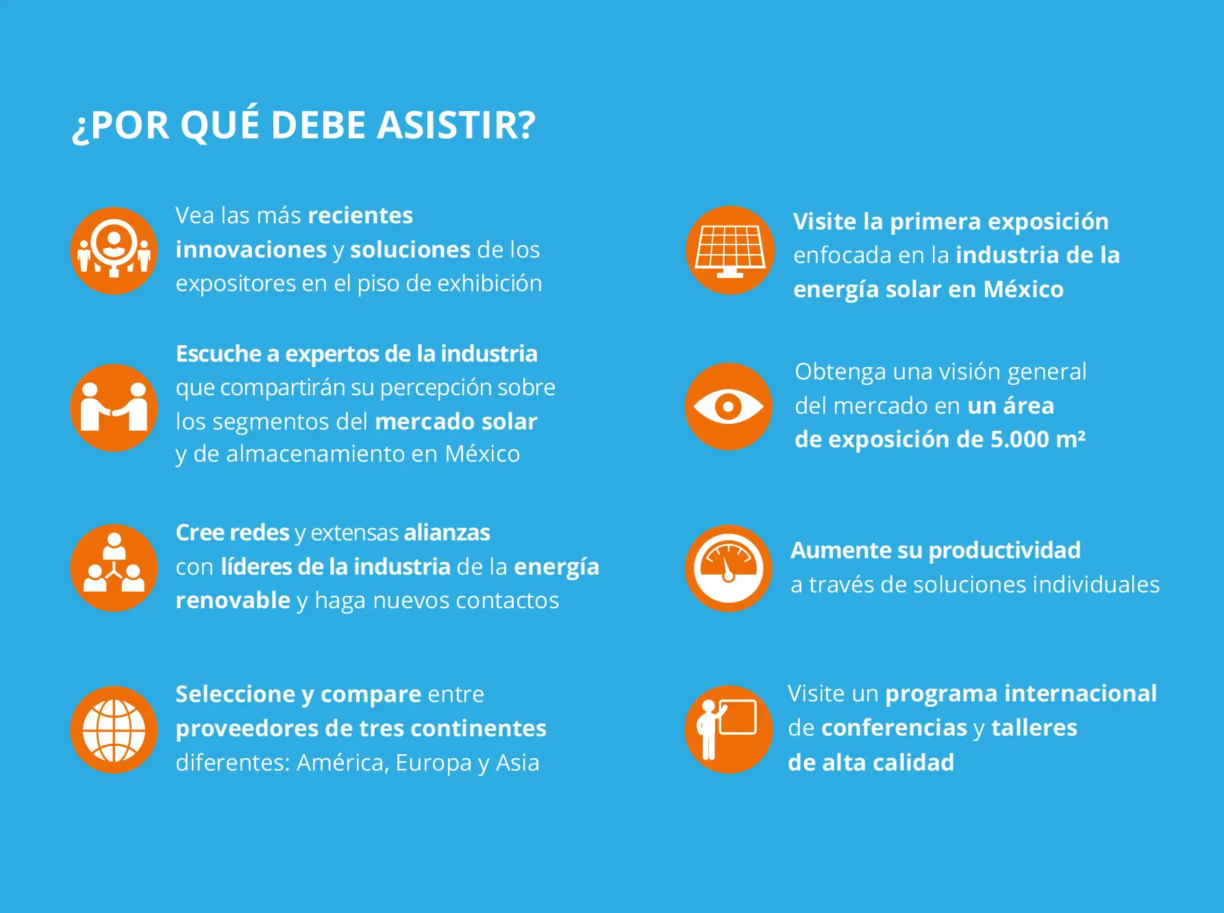 SOLAR + STORAGE MEXICO reúne la experiencia global en energía solar en un solo lugar durante tres días de investigación, descubrimiento y negocios reales. En este evento tendrá la oportunidad de encontrarse cara a cara con expertos en el sector de la energía solar, el almacenamiento de energía y las redes inteligentes, como: